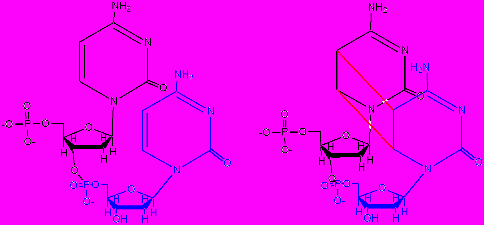 « Золотистая ксеродерма – редкое заболевание кожи у людей. Оно наследуется как аутосомный рецессивный признак. У гомозиготных больных кожа крайне чувствительна к солнечному и ультрафиолетовому свету. Серьезные поражения кожи наблюдаются уже в детстве, а с возрастом они приобретают все более тяжелый характер. Кожа становится сухой, и дерма в значительной степени атрофируется. Появляются кератозы, веки покрываются рубцами, поражается роговица. Обычно во многих местах возникает рак кожи. Многие больные погибают, не достигнув 30 лет, от метастазов этих злокачественных опухолей кожи.» - Страйер Л. Биохимия: В 3-х т. Т.3 Пер. с англ. – М.: Мир, 1985.- 400 с., ил. – С. 35-36.