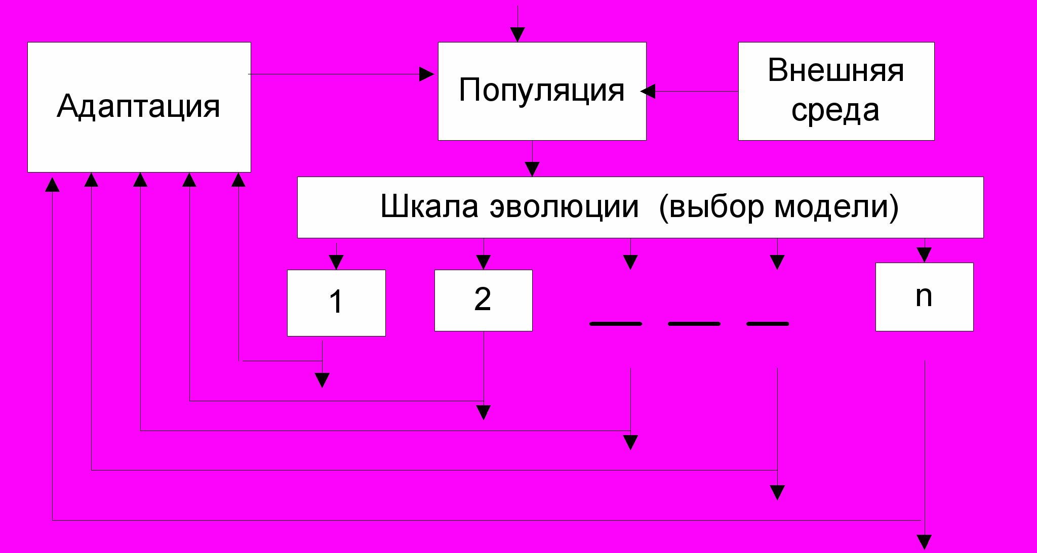 Автор считает важным объединение всех видов и моделей эволюций в интегрированную многоуровневую модель. На рис.6 приведена условная интегрированная схема эволюции. Отметим, что блоки 1-n соответствуют рассмотренным схемам моделей эволюции. Основным этапом в каждой модели эволюции является анализ популяции, ее преобразование тем или иным способом и эволюционная смена форм.