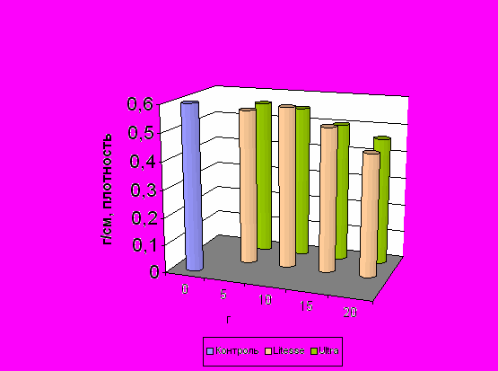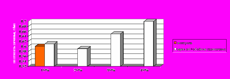 Рис. 9. Влияние обойной пшеничной муки на плотность затяжного печеньяВ этом случае уменьшается плотность и улучшаются органолептические свойства готовых изделий по сравнению с контролем. Выбранная дозировка использовалась в последующем эксперименте, посвященном изучению влияния ПД «Litesse» и «Litesse Ultra» на плотность затяжного печенья, содержащего обойную муку (рис. 10).
