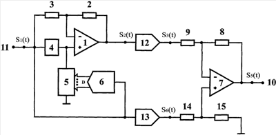 Операционный усилитель 7, третий 8, четвертый 9, пятый 14 и шестой 15 резисторы образуют блок суммирования с одним инвертирующим и одним неинвертирующим входами. Блок суммирования выполняет операцию сложения двух сигналов S3(t) и S4(t), поступающих с выходов первого 12 и второго 13 двухполупериодных выпрямителей, соответственно. В результате на выходе