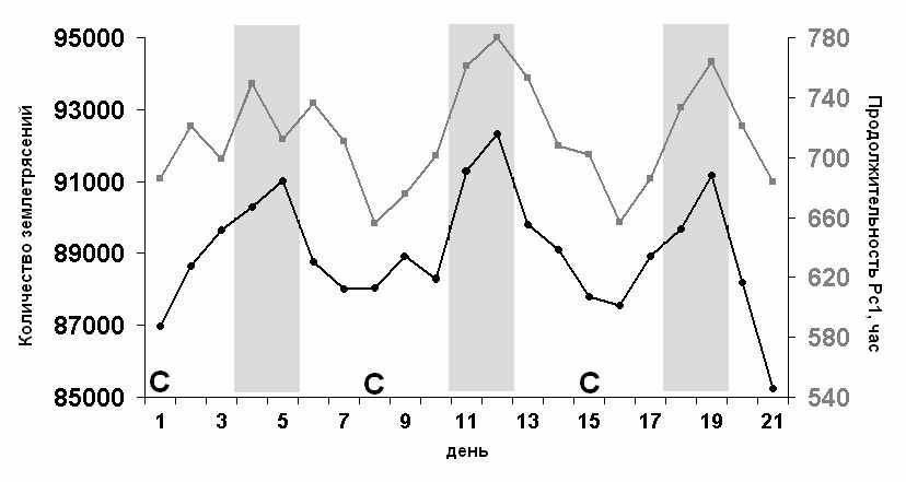 Рис. 1. Недельные циклы активности магнитосферных волн Рс1 (верхние точки, правая шкала) и глобальной сейсмической активности (нижние точки, левая шкала). Мерой активности Рс1 служит продолжительность колебаний в часах, а мерой сейсмической активности – количество землетрясений с магнитудами M ≤ 5.5. Символ “С” означает среду. Вертикальными полосками отмечены выходные дни (суббота и воскресенье). Числа трехнедельных интервалов, использованных для накопления, составляет 600 для Рс1 и 700 для землетрясений.