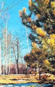 Растения: сосна, подснежник, мать-и-мачеха, подсолнечник, ромашка, колокольчики, тополь, боярышник, черёмуха и др.