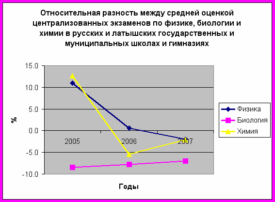 Некорректно сравнивать результаты экзаменов разных лет между собой, так как никто не может гарантировать равной сложности заданий. Мы сравнивали разность между средним баллом выпускников нелатышских и латышских школ. При расчете относительных показателей за 100% принимался средний балл латышских выпускников.