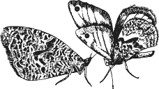 Рис. 8. Сатир Семела. Вид с дорсальной (вверху} и вентральной (внизу) сторон. Пахучие чешуйки на переднем крыле самца находятся в черном кружке
