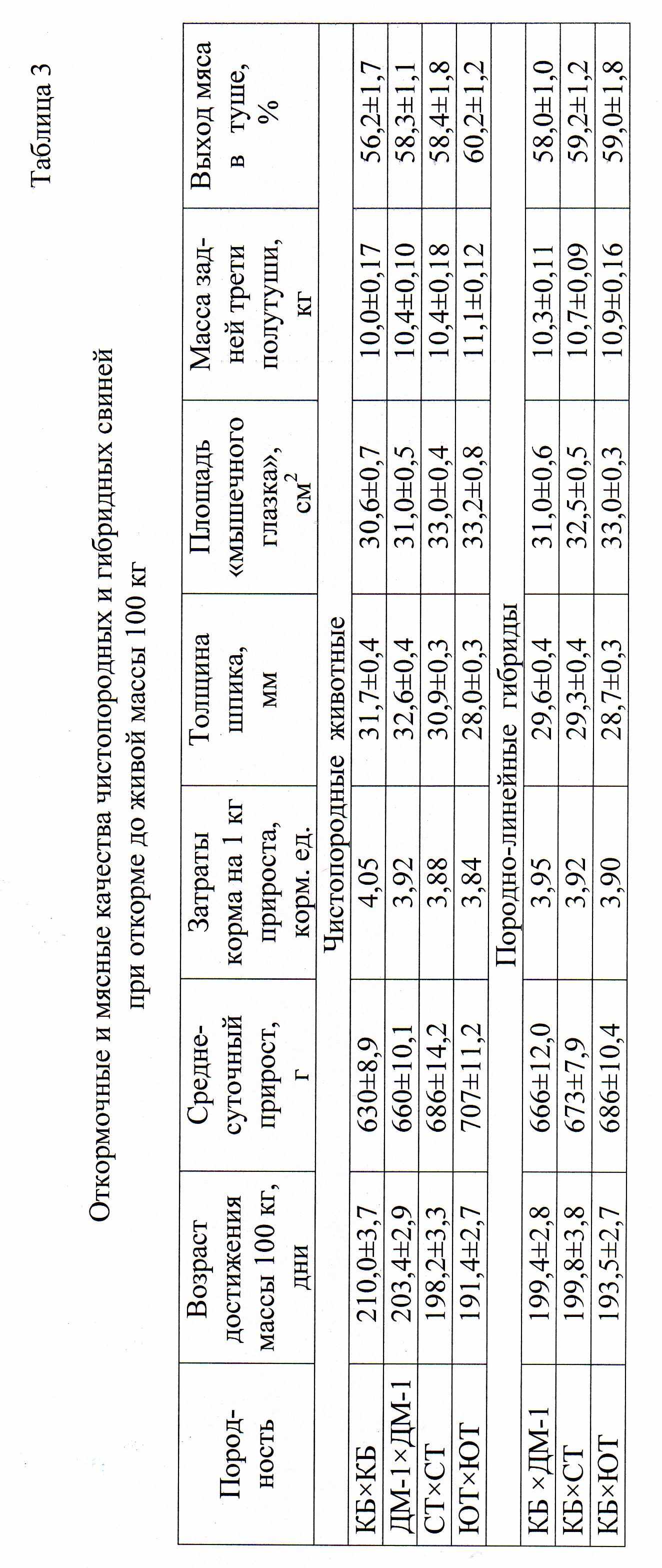 В эксперименте на свиньях СТ и ДМ-1 и гибридах от реципрокного скрещивания откорм проводился до живой массы 100, 120 и 130 кг. Лучшую скороспелость показал молодняк СТ, опередив на 6,9 дня (Р>0,999) сверстников ДМ-1 по срокам достижения массы 100 кг. Приросты массы у него были выше на 49 г (Р>0,999), расход кормов меньше на 0,18 корм. ед. (Р>0,999).