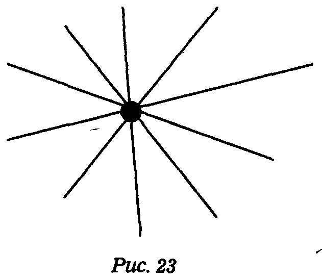 Точка — начало всего. Из точки можно провести множество разнообразных линий. А теперь нарисуйте точку и предложите ребенку провести через нее столько линий, сколько он сможет (рис. 23). Спросите: «Сколько линий ты провел?». Если он провел три-четыре линии, помогите ему провести как можно больше линий, чтобы потом услышать: «Через точку можно провести очень много линий». Объясните, что очень-очень много называется «множество», и через точку можно провести множество линий. Прямые линии проводятся с помощью линейки. Покажите малышу, как ею надо пользоваться, чтобы она не скользила и линии получались красивые. Этот навык приходит постепенно, не торопите малыша.