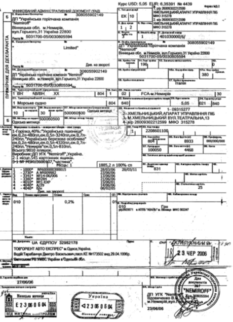 Рис.2. Приклад оформлення експортної ВМД при експорті горілчаної продукції в США морським транспортом (з доставкою контейнерів доморського порту по Україні митним перевізником)