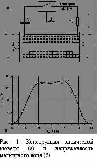 акое расщепление и столкновительное уширение линий приводит к перекрытию их контуров, что позволяет усиливать короткие 10.1 пс импульсы излучения в среднем ИК диапазоне при наличии инверсной населенности на лазерных переходах [2]. Для исследования изменения спектра поглощения молекул NO была разработана оптическая кювета (внутренний диаметр 14 мм) с магнитным полем (рис. 1). При разряде батареи конденсаторов С = = 0.33 мФ через соленоид (200 витков медного эмалированного провода диаметром 2 мм, индуктивность 0.23 мГн) в кювете создавалось магнитное поле до 140 кГс.