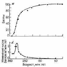Рис. 17. Специализация и темп аристогенеза двоякодышащих рыб от силура (по реконструкции) до наших дней. По Т. С. Уэстоллу. а — уровень специализации — степень обновленности признаков (преобразования в направлении их современных модальностей), выраженная в условных средних баллах; б—темп аристогенеза—скорость обновления признаков, осуществлявшегося в нескольких параллельно развивавшихся филетических линиях