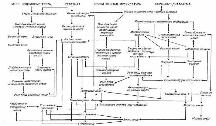 Рис. 19. Активизация функции легочного дыхания как ключевой ароморфоз синдрома дефинитивных признаков рептильного уровня организации (курсив) и некоторых признаков уровня организации высших позвоночных. Составил А. С. Раутиан по данным Н. Н. Иорданского с дополнениями.