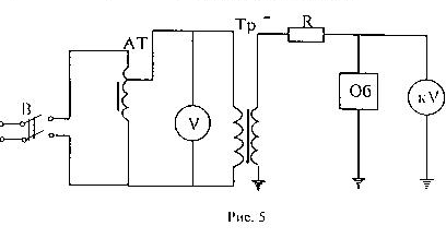 АТ – лабораторный автотрансформатор, служащий для регулирования напряжения; V – вольтметр на низкой стороне повышающего трансформатора; Тр – высоковольтный трансформатор; R – резистор служит для защиты трансформатора от больших токов и большой крутизны среза напряжения при перекрытии объекта испытания; Об – объект испытания; кV – электрический киловольтметр С-100.