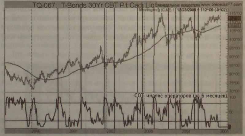 Если вы внимательно смотрели на какой-либо из графиков, представленных до сих пор, то должны были заметить, что временами операторы покупают или продают слишком рано, иногда чересчур рано. И все же чем дольше вы смотрите, тем больше вы замечаете, что зачастую у них проявляется сверхъестественная способность покупать или продавать как раз перед началом крупных подвижек рынка. Можем ли мы воспользоваться тем, как исключительно точно наши любимые игроки учитывают положение дел с покупками и продажами? Я не сомневаюсь, что можем, и, чтобы обосновать это утверждение, хочу, чтобы вы шаг за шагом прошли следующий урок, но сначала продемонстрирую вам график того, что кажется несколько беспорядочным рынком относительно позиций операторов, а именно — облигаций.