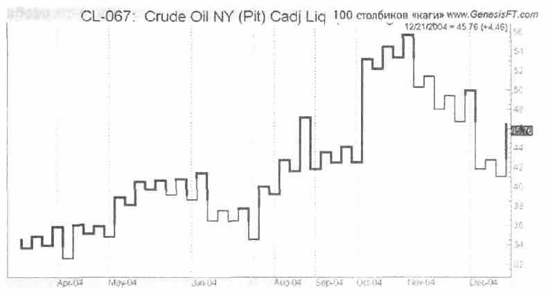 Рис. 14.6. График столбиков «каги» для сырой нефти Источник: Genesis Financial Technologies, Inc. (ссылка скрыта).