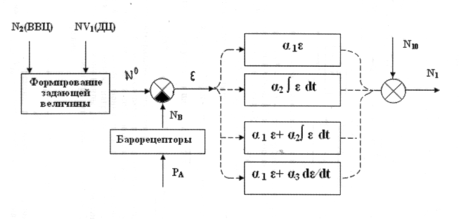 Математические модели сердечно-сосудистой регуляции. Большинство авторов публикаций с описанием сердечно-сосудистого центра излагают свои взгляды на регуляцию кровообращения, используя вербальные средства. Что касается не вербальных, а математических интерпретаций, то они включают простые одно- и двухконтурные регуляторы АД и/или МОК. Сама регуляция представлена в них традиционно в рамках теории автоматического регулирования (например, [7,11,12,20,21]).