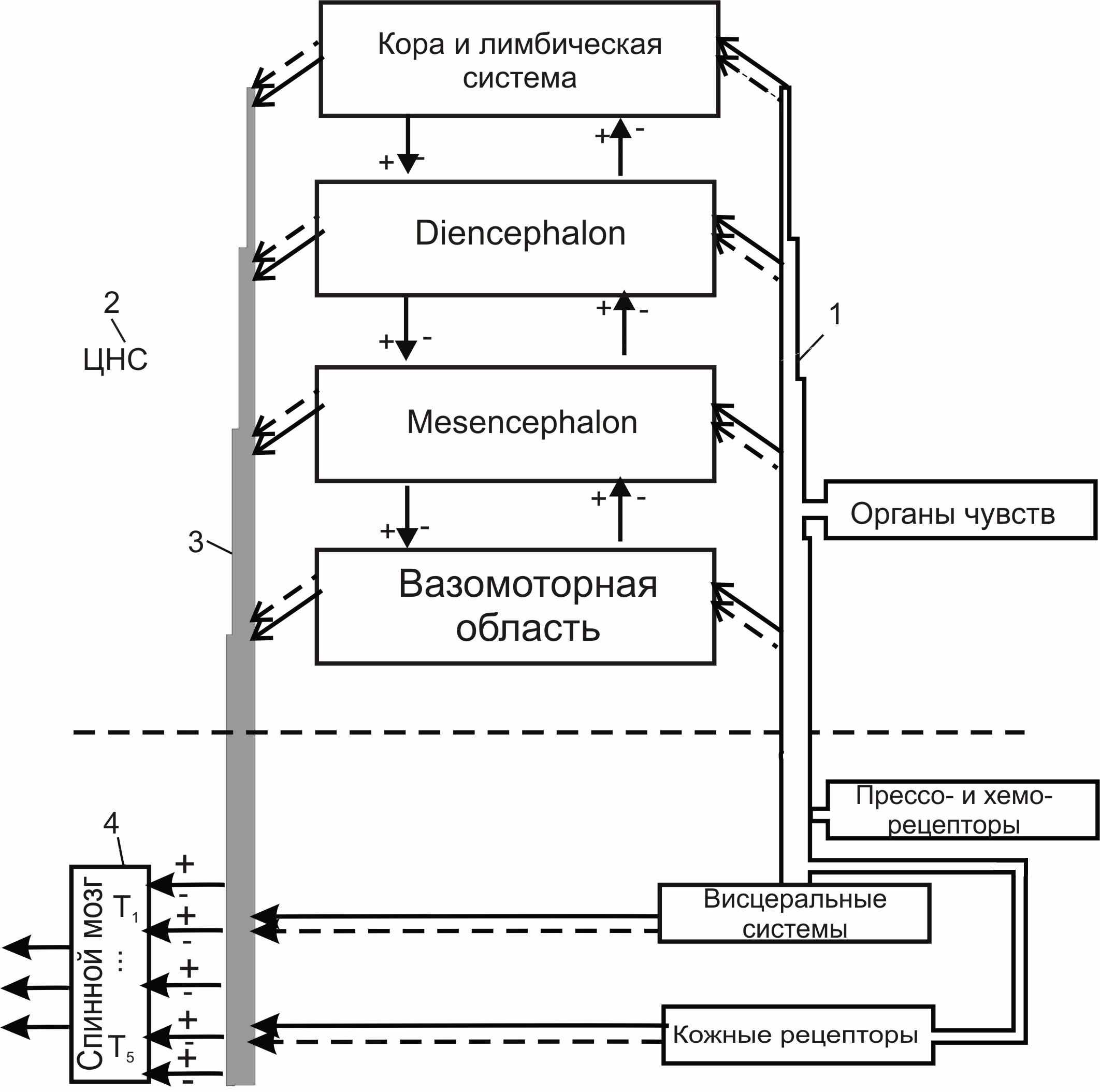 Система регуляции рассматривается здесь как единый интегративный механизм, состоящий из четырёх равноправных частей: 1 - кожные и висцеральные афференты, а также прессо- и хеморецепторы; 2 - центральная связующая система (ЦНС); 3 - эфферентные выходы из ЦНС к спинному мозгу; 4. спиной мозг с выходом к сердцу и сосудам.