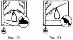 На ветках деревьев, используемых птицами в качестве насеста (которые нетрудно определить по обилию помета на нижерасположенных ветках и земле), можно установить несколько петель, с таким расчетом, чтобы они оказались на уровне голов сидящих птиц (рис. 193).