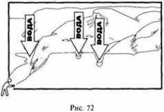 И, наконец, самый простой (но это не значит, что самый плохой) фильтр – это «земляной насос». Для его устройства не надо ничего – ни ткани, ни палок. Достаточно иметь водоем с подозрительного вида водой и шанцевый инструмент – лопатку, нож или просто заостренную палку. Этим инструментом в 50 100 см от водоема необходимо выкопать глубокую, не менее полуметра, ямку и подождать, пока она заполнится водой. Затем воду осторожно вычерпать подождать, пока ямка вновь наполнится, и снова вычерпать. И так до тех пор, пока вода не станет чистой и прозрачной (рис. 68).