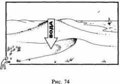На морских побережьях почти всегда можно добыть пресную воду, выкопав колодец за дюнами, которые окаймляют прибрежную зону. Объясняется это тем, что дождевая вода, фильтруясь сквозь песок дюн, всплывает и скапливается на поверхности более тяжелой морской воды, просочившейся из моря. Таким образом образуются тонкие пресноводные линзы, «лежащие» на поверхности соленой воды (рис. 74).
