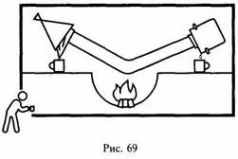 Простейший паровой опреснитель (рис. 69) можно изготовить из любой металлической трубы, согнутой под прямым углом – коленом. Труба устанавливается раструбами вверх на две негорючие опоры, например два песочных валика. Внутрь трубы заливается вода. В месте сгиба разводится огонь. На концы трубы надеваются металлические кастрюли или банки, выложенные изнутри тканью. Пар от кипящей воды осаждается на прохладном металле кастрюль, впитывается тканью и по капле стекает в подставленные емкости.