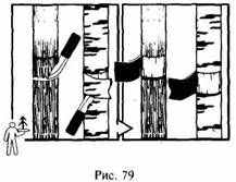 Самый простой – это сделать ножом или топором на стволе два глубоких круговых горизонтальных надреза и два соединяющих их вертикальных. Снять верхнюю кору, поддев ее с одной стороны ножом. Если она поддается плохо, можно использовать небольшие деревянные клинышки, вбиваемые между стволом и корой (рис. 79).