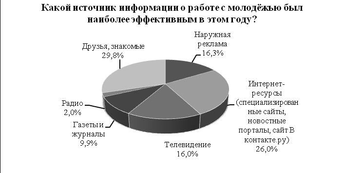 Информационное обеспечение программ и мероприятий молодежной политики является важной составляющей их эффективной организации. Самыми приоритетными информационными источниками Года молодежи стали для респондентов их сверстники и сеть Интернет. На первое место по значимости опрошенные поставили своих друзей и знакомых (30%); на второе место – Интернет ресурсы (26%). Традиционные СМИ оказались значимыми для меньшей молодежной аудитории: телевидение было важно для 16% опрошенных (что равно доле наружной рекламы); газеты и журналы – для 10%; радио – для 2%.