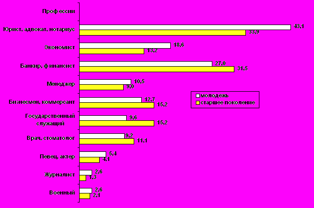 Падение “престижности” и “доходности” в общественном мнении молодежи ряда специальностей не означает падения престижности и доходности квалифицированного труда вообще, а означает лишь смену приоритетов в рамках специальностей квалифицированного и высококвалифицированного труда. Это хорошо видно на примере ответов молодежи на открытый вопрос о наиболее престижных и прибыльных профессиях (см. рис. 8 и 9).