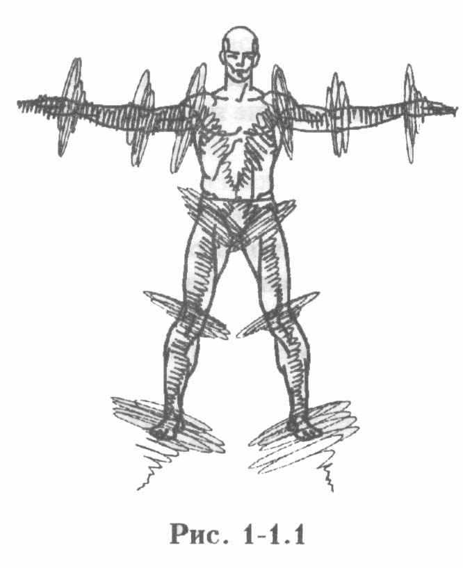 Когда я поселился в монастыре, мне первым делом объяснили, что в человеческом теле имеется девятнадцать энергетических центров, именуемых «вихрями», - продолжил полковник прерванный рассказ. - Семь из них являются основными, а двенадцать -второстепенными. Эти вихри - мощные полевые образования, невидимые глазом, но тем не менее вполне реально существующие. Местоположение второстепенных вихрей соответствует положению суставов конечностей: шесть верхних второстепенных вихрей соответствуют плечевым суставам, локтевым суставам и лучезапястным суставам и кистям рук; шесть нижних второстепенных вихрей соответствуют тазобедренным суставам, коленям и голеностопным суставам со ступнями (Рис. 1). Когда ноги человека разведены не слишком широко в стороны, коленные вихри соединяются, образуя один большой вихрь, по количеству сконцентрированной в нем энергии приближающийся к основным. А поскольку обычный человек крайне редко оказывается в ситуациях, требующих от него выполнения интенсивных широкоамплитудных махов ногами, выполнения "шпагатов" и тому подобных упражнений, коленные вихри его почти всегда представляют собой один вихрь, пространственная форма которого все время изменяется в соответствии с движениями тела. Поэтому иногда коленный вихрь относят к числу главных в качестве дополнительного, восьмого, и говорят не о девятнадцати, а о восемнадцати вихрях.