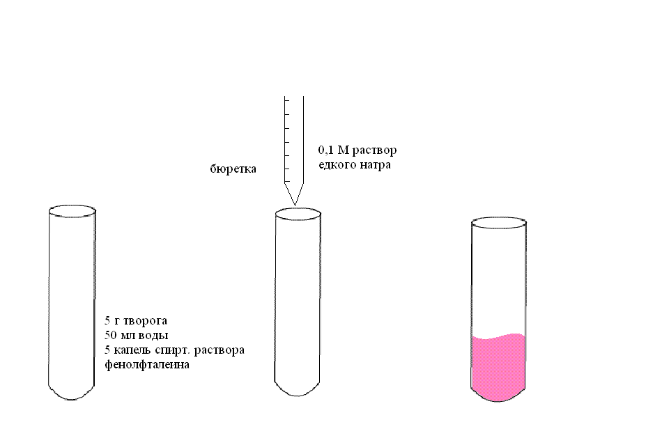 раствор фенолфталеина, 5 г творога, 40 мл молока, 0,1 -молярный раствор едкого натра. Бюретки, заполненные 0,1 - молярным раствором едкого натра. Водопроводная вода. Дистиллированная вода, 0,5 л молока; 10- процентный раствор соляной кислоты. Пробиркодержатель - 2 шт., коробок со спичками, подставка для горючего. Сухое горючее - 1 таблетка. Химический стакан на 150-200 мл., пробирки 10 шт.