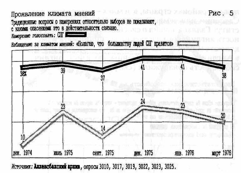 После выборов в бундестаг в 1972 г. оказалось, что один вопрос, как вспышка, высветил неравенство противостоящих лагерей — практически равных по числу своих членов и сторонников — с точки зрения их силы, «подачи» себя публично. Вопрос звучал гак: «Различные партии использовали много плакатов, значков, символики для автомашин. Символику, плакаты, значки какой партии можно было, по Вашему мнению, видеть чаще всего?» 53% респондентов ответили: предвыборной символики СПГ, 9% — ХДС/ХСС. Второй вопрос перепроверял это же обстоятельство с другой стороны: «Результаты партии на выборах в значительной степени зависят от активности ее сторонников в ходе предвыборной кампании. Сторонники какой партии обнаружили, по Вашему мнению, наибольшую личную увлеченность, чрезмерную склонность к