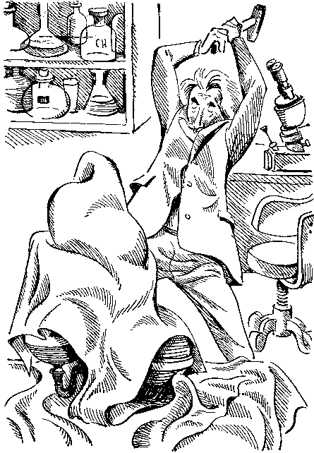 Купрум Эс занялся уборкой. Возле одной из стен стоял глухой незастекленный шкаф, дверцы которого были распахнуты. Учитель отключил от сети и поставил в этот шкаф свой аппарат. Затем он принялся убирать склянки. Работая, он то и