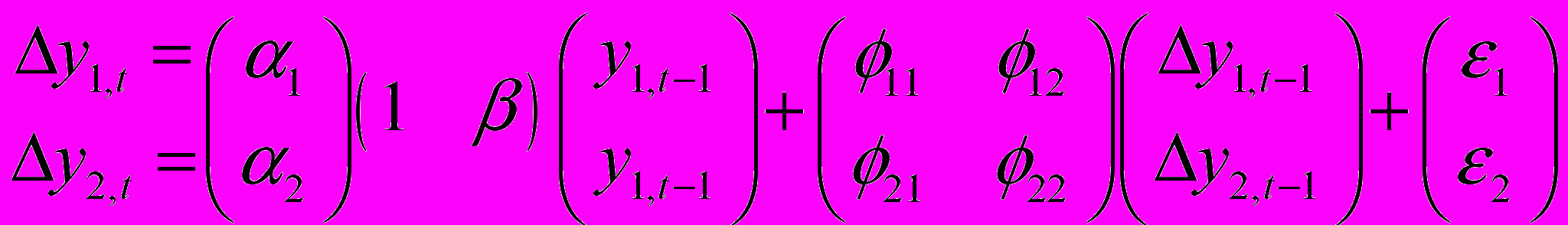 Во всех случаях гипотеза о том, что ранг коинтеграции равен 0 отвергнута на 1% уровне, в то время как гипотеза о том, что ранг коинтеграции равен 1 не может быть отвергнута. Из этого следует, что исследуемые ряды данных связанны долгосрочным равновесным взаимоотношением, и мы можем протестировать его силу и статистическую значимость.