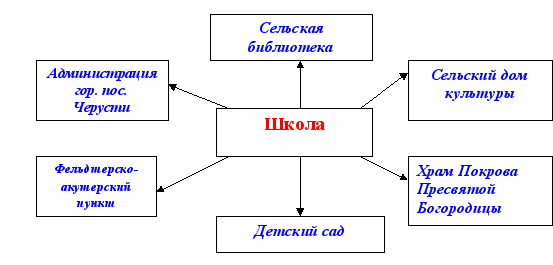 Социальное партнерство характерно для образовательного процесса школы. Для формирования единого образовательного пространства, удовлетворения запросов обучающихся и их родителей, целенаправленно выстраивается школьная система внешних связей. Установлено тесное сотрудничество школы с сельским домом культуры. Школе принадлежит ведущая роль во взаимодействии с социальной средой, что позволяет охватить все объекты и все субъекты образовательного процесса, видеть динамику развития школы в целом.