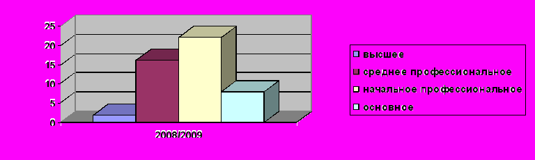 Диаграмма № 8. Квалификационный уровень педагогов.Педагоги школы через обучение на курсах ПАПО, а также в районном центре повышения квалификации повышали свой профессиональный уровень. В 2008/2009 учебном году курсы повышения квалификации прошли 8 человека. (См. диаграмму № 9 «Повышение квалификации педагогического коллектива за 2007-2009 год).