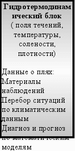 Предложенная модель оценки состояния морских экосистем имеет блочную трехуровневую структуру ( рис.1 ). На первом уровне моделирования учитываются отдельные процессы, чаще всего устанавливаемые эмпирически: выражения для законов гидромеханики, оптики, термодинамики, закономерности химических реакций, фотосинтеза, роста биомассы организмов [ 1,2 ]. Взаимодействие процессов представлено блоками второго уровня: гидротермодинамическим, гидробиологическим и гидрохимическим (рис. 1).