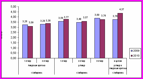 По отношению к прошлому году в химическом составе воды Амурской протоки практически больших изменений не наблюдалось. По качеству вода осталась аналогично прошедшему периоду в 3-ем классе разряде «б». По отношению к 2009 году возрос уровень загрязненности в черте города и несколько снизился в фоновом створе. Это хорошо прослеживается в изменении УКИЗВ.