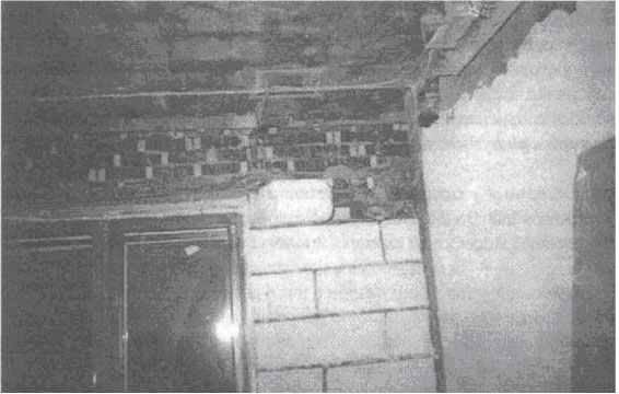 Рис. 2. Разрушение кирпичного слоя стены из пустотелого керамического кирпича, вызванное замерзанием в пустотах конденсационной воды, поступившей из помещения через незаполненный зазор между верхом внутреннего слоя стены и низом плиты перекрытия.