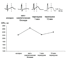 1.2. Изменение длительности реполяризации левого желудочка сердца при повышении гемодинамической нагрузки зависит от состояния автономной нервной системы. При фармакологической блокаде (атропином и др.) вегетативной нервной системы длительность реполяризации увеличивается и на фоне блокады при перегрузке левого желудочка происходит уменьшение длительности реполяризации. (к.б.н. Седова К.А., Гошка С.Л., к.б.н. Азаров Я.Э., д.б.н. Шмаков Д.Н.) (6.11. – Физиология нервной и висцеральной систем. Клиническая физиология) (рис. 2). (ИФ Коми НЦ УрО РАН).