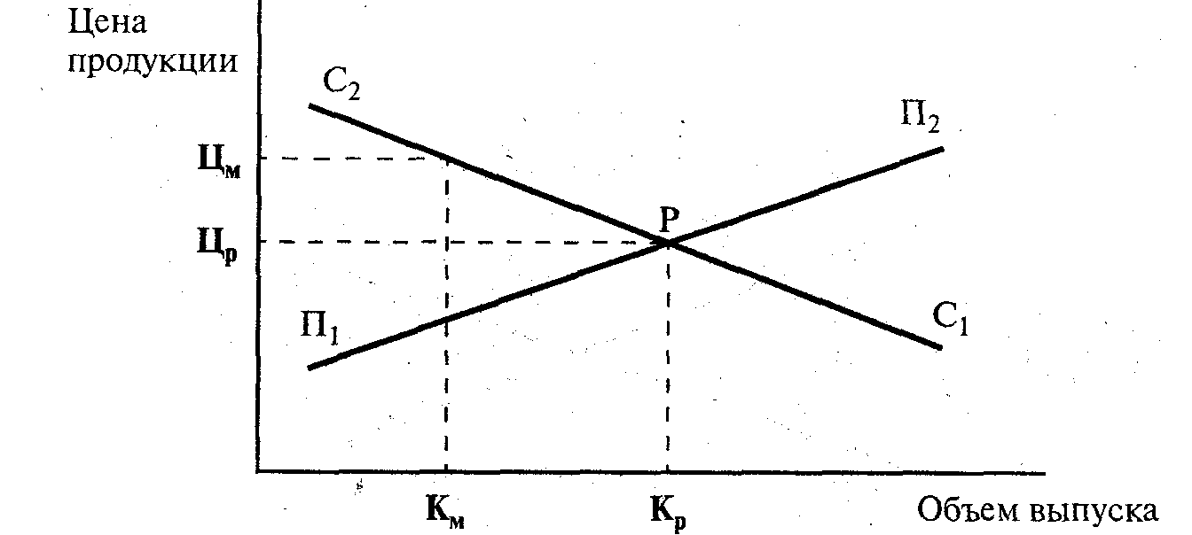 Предположим, что в какой-то отрасли до захвата ее рынка монополией (то есть в условиях конкуренции) цена равновесия (LL) образовалась на уровне точки равновесия (Р), где пересеклись кривая спроса (C1-C2) и кривая предложения (П1-П2). При этом равновесный объем выпуска продукции составил величину Кр. Но затем монополия, учитывая эластичный спрос, сокращает уровень выпуска продукции до величины КМ. Это в конце концов позволяет установить монопольно высокую цены ЦМ.