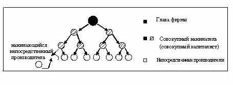 1)Главными действующими лицами в капиталистическом обществе являются: главы более или менее крупных авторитарно управляемых групп, являющиеся верховными собственниками (по отношению к своим подчиненным—авторитарными, по отношению друг к другу—частными) средств производства и рабочих сил—рабочих сил непосредственных производителей и администраторов, образующих бюрократический аппарат управления непосредственными производителями. Непосредственные производители и администраторы делают себя подчиненными этих лиц, а свою рабочую силу—их собственностью, продавая ее им. Однако в результате такой самопродажи они не становятся рабами, поскольку продают свою рабочую силу частично—а) поступают в подчинение к нанимателю не на все 24 часа в сутки, а лишь на часть суток (кроме того, бывают еще такие вещи, как выходные и отпуска); б) обязуются выполнять не любой приказ нанимателя, но лишь приказы по поводу более или менее четко определенных видов деятельности; в) как правило, продают свою рабочую силу не пожизненно, а лишь на определенный срокiv[4]; сами непосредственные производители, продающие свою рабочую силу нанимателям. Следует отметить, что по отношению к работнику, нанимающемуся на работу в данном капиталистическом предприятии (фирме, корпорации и т.д.), нанимателем является не только глава (один человек или коллегия) данной авторитарно управляемой группы, но и вся та часть этой группы, которая состоит из людей, стоящих в данной группе на более высоких ступенях иерархической лестницы, чем та ступень, на которой окажется работник в результате своего устройства на работу в данном предприятии. Глава предприятия является лишь верховным нанимателем, воплощающим в себе единство этой подгруппы—совокупного нанимателя. Таким образом, по отношению к непосредственному производителю в качестве совокупного капиталиста выступает не только глава фирмы, но и все подчиненные ему начальники, составляющие административный аппарат последней. Мы видим, что на капиталистическом предприятии каждый начальник выступает по отношению к своему подчиненному как частичка совокупного капиталиста, единство которого воплощено в главе фирмы, а по отношению к своему начальнику—как пролетарий. Возьмем наугад любого работника капиталистической фирмы, являющегося одновременно чьим-то начальником и чьим-то подчиненным, и попробуем определить, кто он в большей степени: капиталист или пролетарий? Если он в большей степени не причастен к собственности на средства производства и рабочие силы, находящиеся в авторитарной собственности данной фирмы, чем причастен к ней, то он пролетарий; если же наоборот, то он (как мы уже говорили об этом выше) капиталистv[5]. Между этими двумя классами, основными для капиталистического способа производства, простирается слой администраторов, являющихся примерно в равной мере капиталистами и пролетариями;  очевидно, этот слой является особым классом, переходным между двумя основными, подобно феодальным администраторам и мелкой бюрократии азиатского типа. Что же это за класс? Марксисты XX века полагают, что мелкая буржуазия: ''…дело идет прежде всего о мелкой буржуазии нового, капиталистического типа, о промышленных, торговых и банковских служащих, о чиновниках капитала…'' [649, с. 300]. Однако вся эта публика отличается от 
