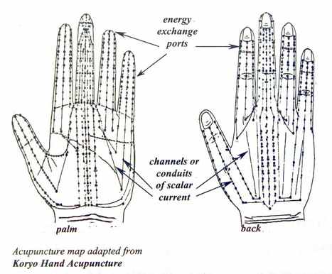 Руки (наряду с ногами) содержат самую большую концентрацию каналов обмена энергии в теле. Акупунктурные точки – это гиперполевые соединители с виртуальными (невидимыми) источниками. Каждая акупунктурная точка имеет связанное с ней торсионное поле, предлагающее потенциальное гиперпространственное взаимодействие (спин-спин взаимодействие). Сеть меридианов связывает поток скалярных течений. Благодаря схожести с другим человеческим существом, рука предоставляет возможности богатых резонансных интерактивных эффектов. Как многомерный инструмент, рука связана с нашими высшими потенциальными состояниями совершенства.