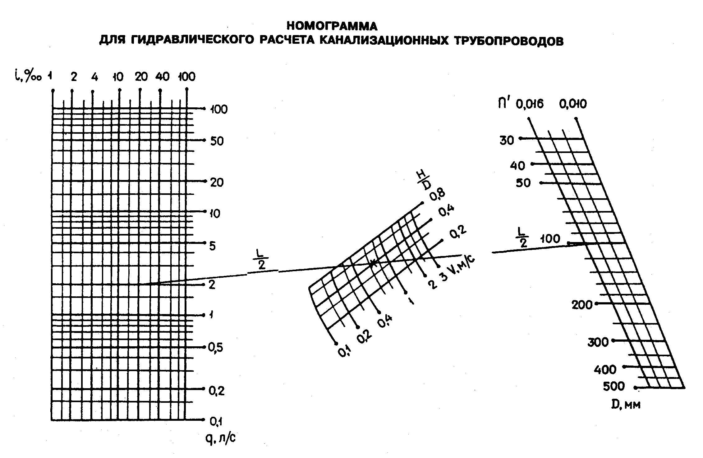 Номограмма для гидравлического расчета канализационных трубопроводов
