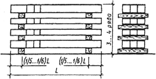 2.5. Складируют колонны на открытых, спланированных площадках с покрытием из щебня или песка (Н=5…10 см) в штабелях, в горизонтальном положении, в три-четыре ряда (смотри Рис.3). Колонны сложных сечений располагают в два-три яруса. Прокладки между колоннами укладываются одна над другой строго по вертикали. Сечение прокладок и подкладок обычно квадратное, со сторонами не менее 25 см. Размеры подбирают с таким расчетом, чтобы вышележащие колонны не опирались на выступающие части нижележащих колонн.