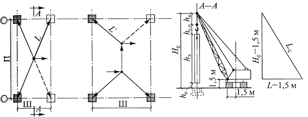 2.7. Эффективность монтажа колонн в значительной мере зависит от применяемых монтажных кранов. Выбор крана для монтажа зависит от геометрических размеров, массы и расположения монтируемых колонн, характеристики монтажной площадки, объема и продолжительности монтажных работ, технических и эксплуатационных характеристик крана (смотри Рис.4а и Рис.4б).