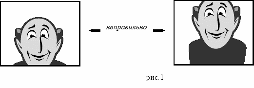- При крупных портретных планах необходимо избегать оставлять мало или много места над головой. Голова человека никогда не должна касаться верхнего края рамки (рис.1), а подбородок – нижнего (рис.2), за исключением очень крупных планов, когда край рамки могут срезать одновременно и подбородок и лоб.