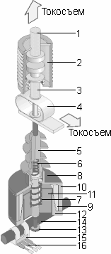 1 – неподвижный контакт ВДК; 2 – вакуумная дугогасительная камера (ВДК); 3 – подвижный контакт ВДК; 4 – гибкий токосъем; 5 – тяговый изолятор; 6 – пружина поджатия; 7– отключающая пружина; 8 – верхняя крышка;
