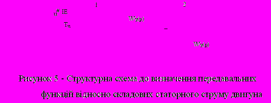 Окремо слід також зауважити, що необхідно при побудові дискретної моделі враховувати імпульсний вплив перетворювача на формування струмів двигуна. Це робиться на підставі структури з ідеальним імпульсним елементом (IE), ланки, що описує перетворювач частоти (рисунок 5, 1), та ланки, що відповідає статорній обмотці двигуна (рисунок 5, 2). Обґрунтування цих передатних функцій наведено в [4].