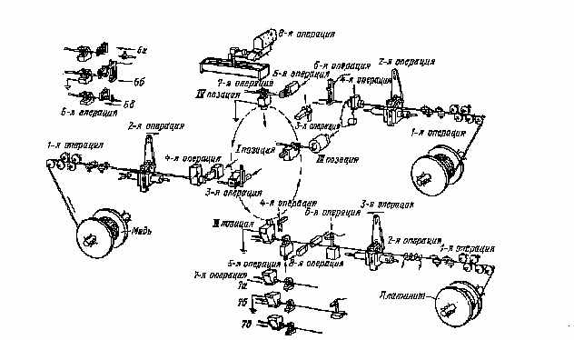 Барабан, поворачиваясь на 90 0, переносит медное звено в позицию II сварки с платинитом (зона нижней сварки). К этой позиции подаётся отрихтованный (операция 1) и просушенный в электроспирали подогрева (операция 2) платинит, установленный на линии сварки с помощью направляющей вилки (операция 4) и центрального зажима (операция 5); одновременно просекатель, электрически соединённый с конденсаторами, прижимается к платиниту (операция 6), просекая слой буры. На позиции II резким перемещением производится сближение концов меди и платинита. Между ними возникает электрический разряд, сваривающий эти два звена (операция 7). После отрезки платинита на заданную длину (операция 8) и отвода платинита назад (для увеличения зазора в месте резки) следует второй поворот барабана на 900. В позиции III специальной оправкой звено палтинита подгибается к оси вращения позиционного барабана для облегчения его центровки в позиции IV. После третьего поворота барабана платинит, сваренный с медью, устанавливается в позиции IV сварки с никелем (зона верхней сварки)