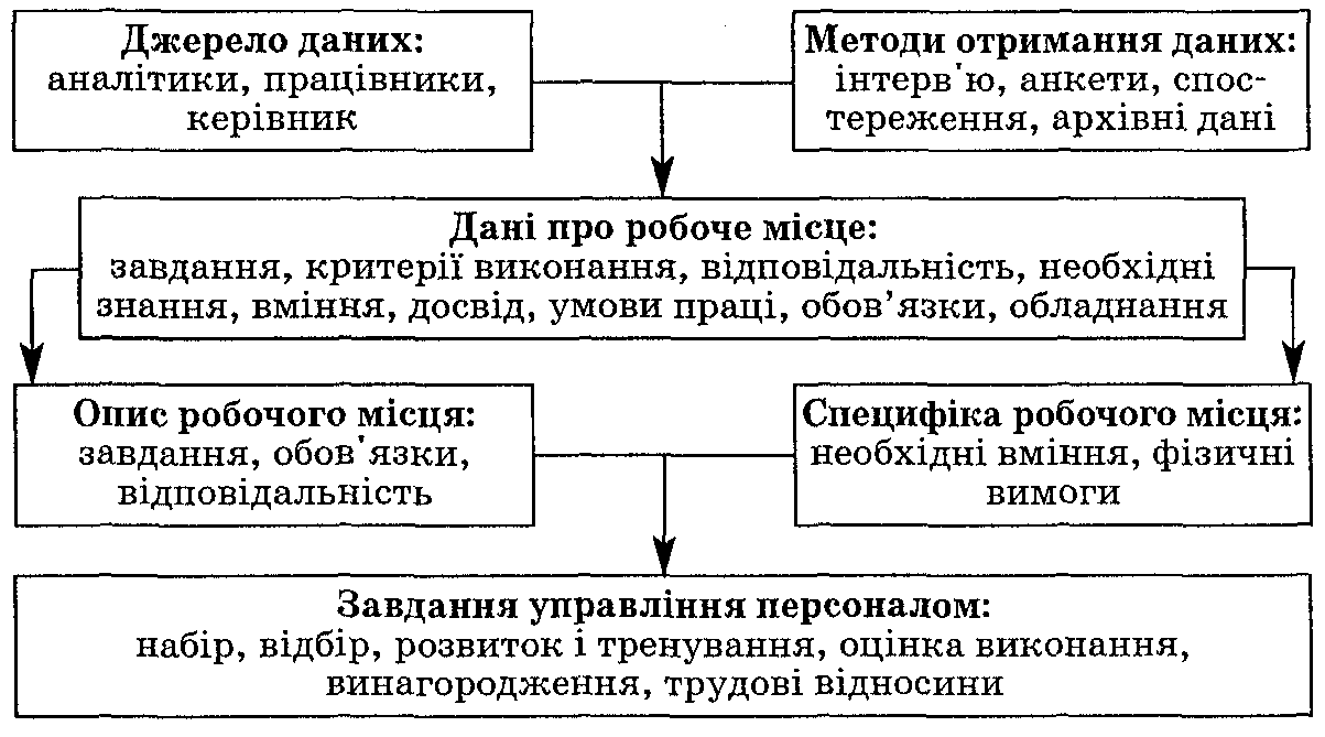 Аналіз праці на певному робочому місці охоплює опис виконуваних дій і необхідних працівнику якостей. При цьому досить складно визначити цілісну універсальну схему здійснення аналізу праці, за допомогою якої можна описати зібрану інформацію. Мінімальна аналітична процедура стосовно кожного робочого місця повинна охоплювати виявлення виконуваних дій на робочому місці, способів їх виконання, визначення вмінь, необхідних для виконання цих дій.