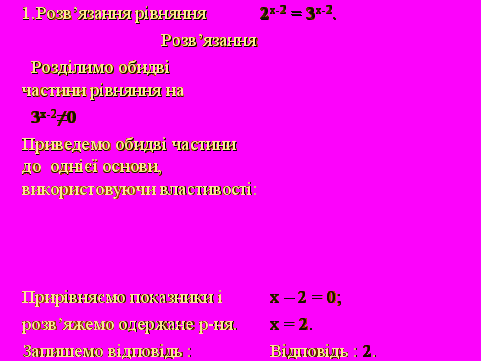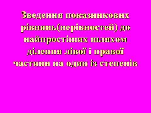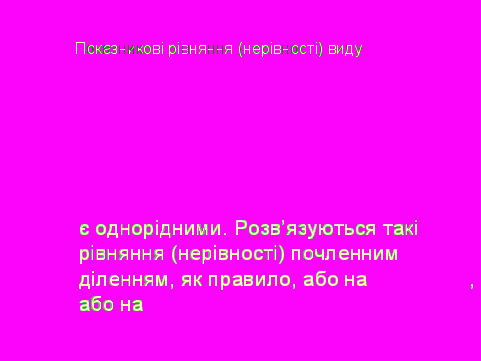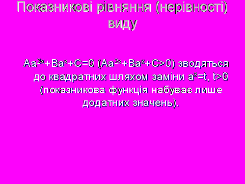 - Показникові рівняння і нерівності, які зводяться до алгебраїчних: