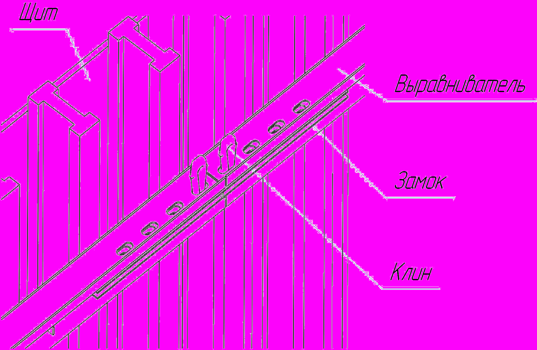 фанеры 1 соединенных саморезами с вертикальными балками 2, выравниватель 3 с помощью адаптеров 6 крепится к балкам 2. Щиты соединяются между собой замками 4 при помощи клиньев 5.